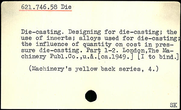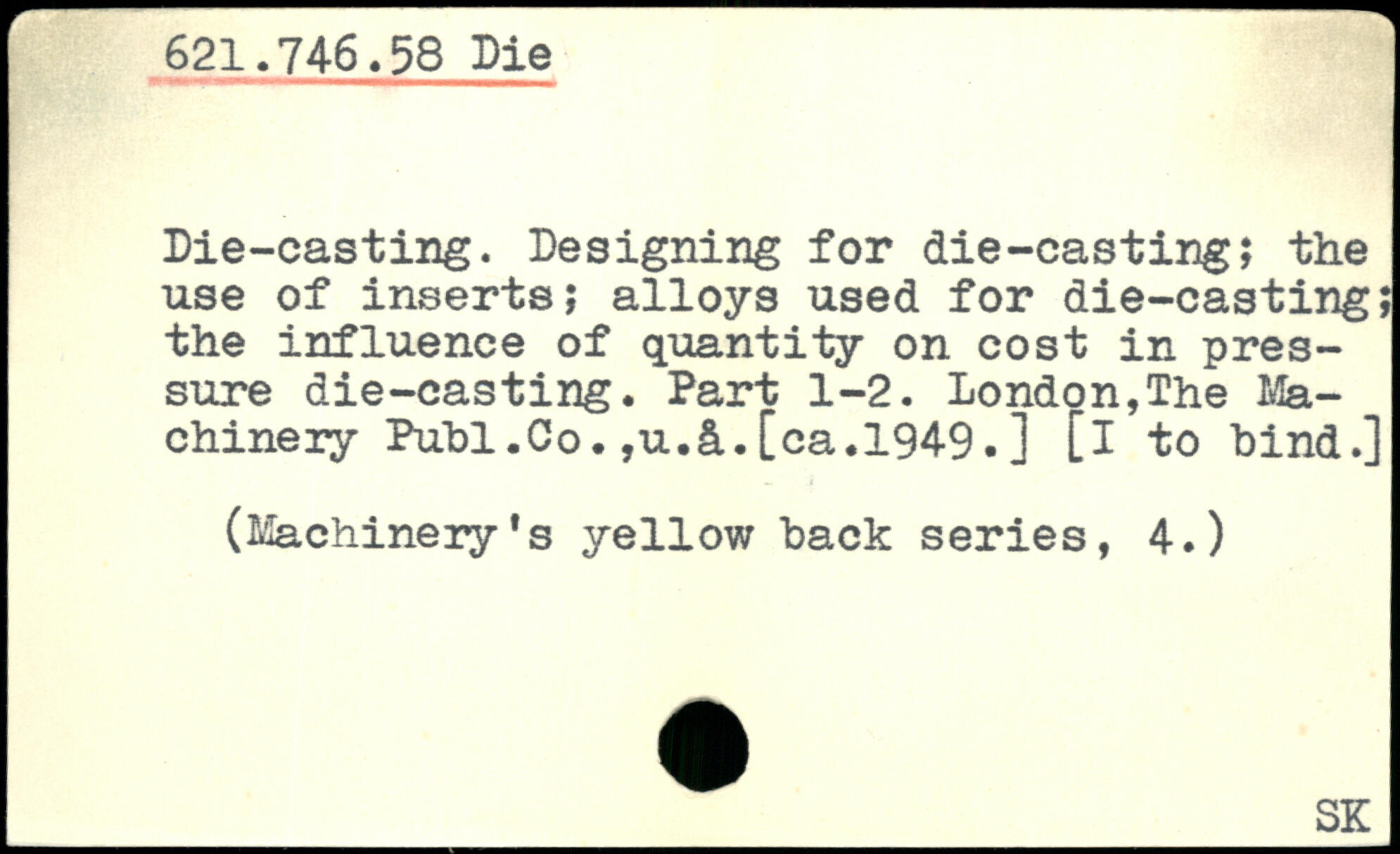 Die-casting. Designing for die-casting; the use of inserts; alloys used for die-casting; the influence of quantity on cost in pressure die-casting. Part 1-2. London,The Machinery Publ.Co. ,u.&.[ca.1949.] [i to hind.] (Machinery's yellow back series, 4.) _SK