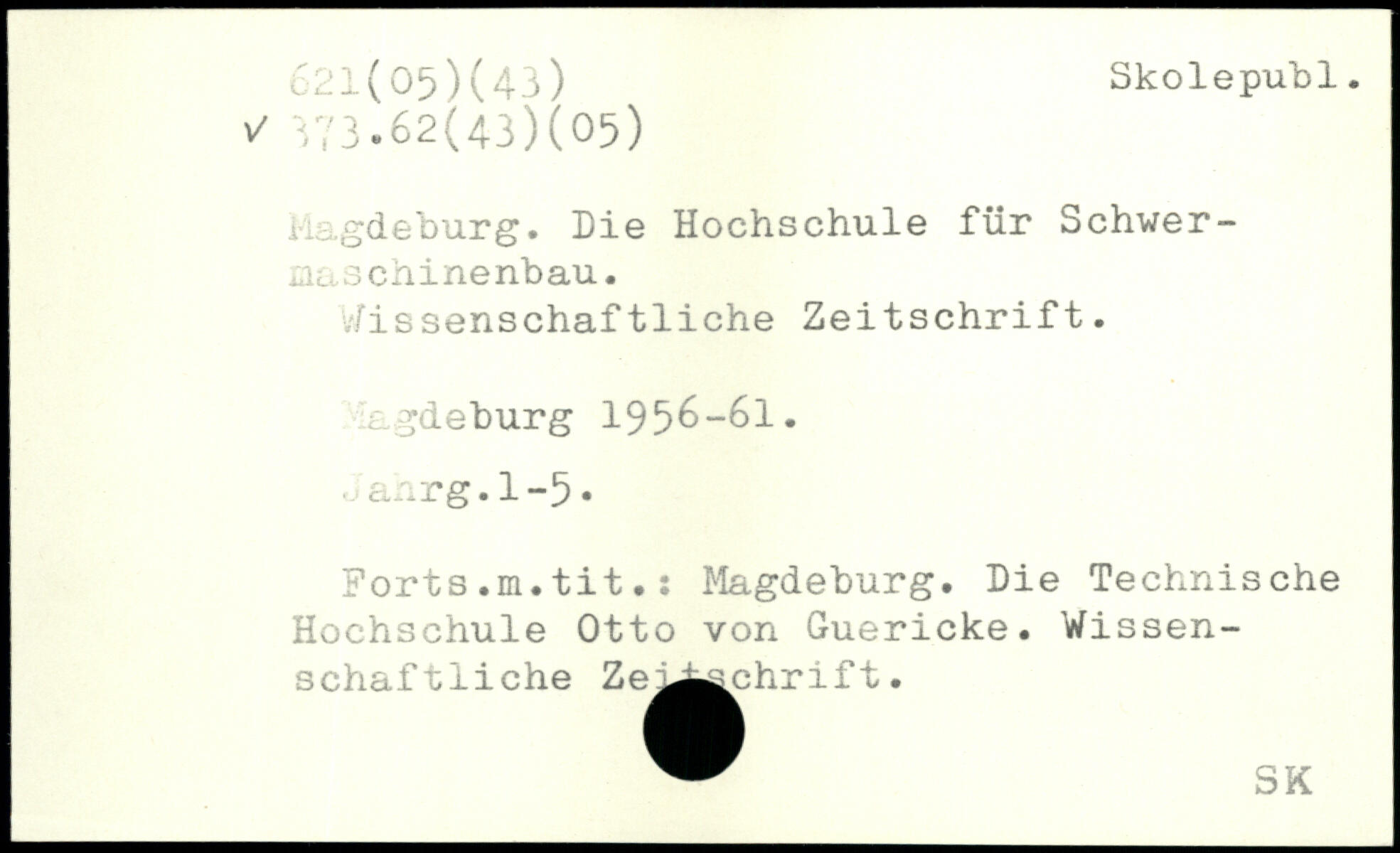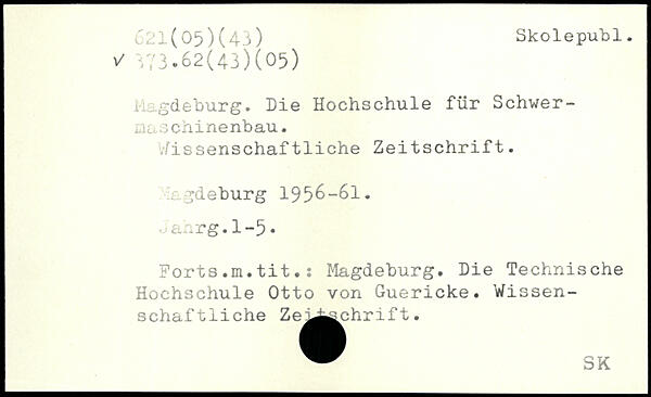 Magdeburg. Die Hochschule für Schwer--alclS chinenbau. I Wissenschaftliche Zeitschrift. agdeburg IJ'jG-Gl, oanrg.1-5. Ports.m.tit.: Magdeburg. Die Technische Hochschule Otto von Guericke. Wissenschaftliche Zej^^chrift.