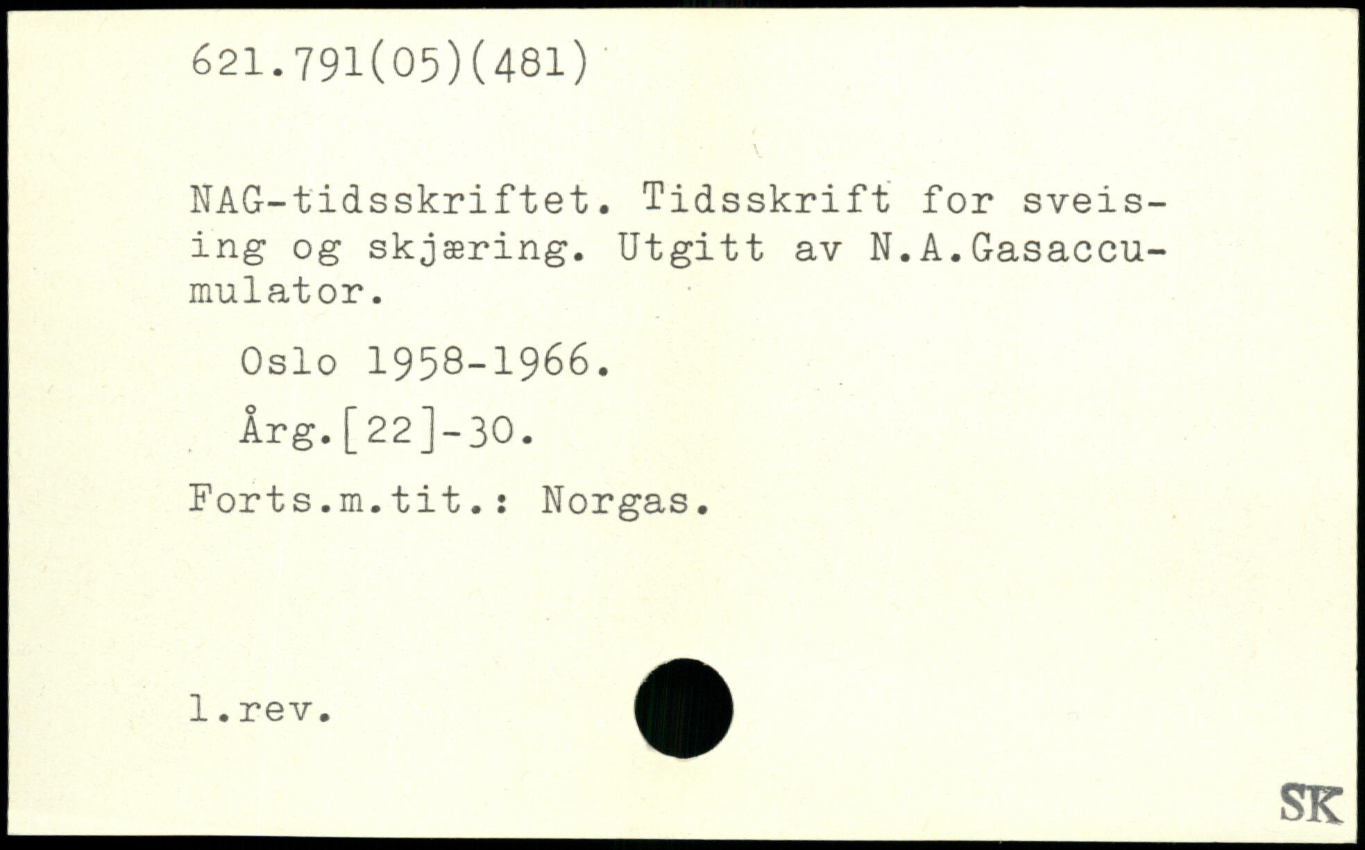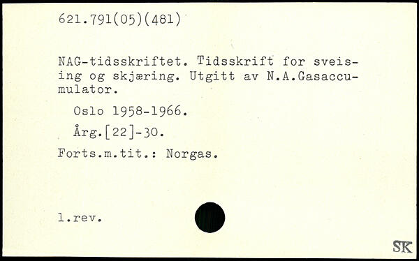 NAG-tidsskriftet. Tidsskrift for sveis-ing og skjæring. Utgitt av N.A.Gasaccu-mulator. Oslo 1958-1966. Årg.[22] — 30. Forts.m.tit.: Norgas.