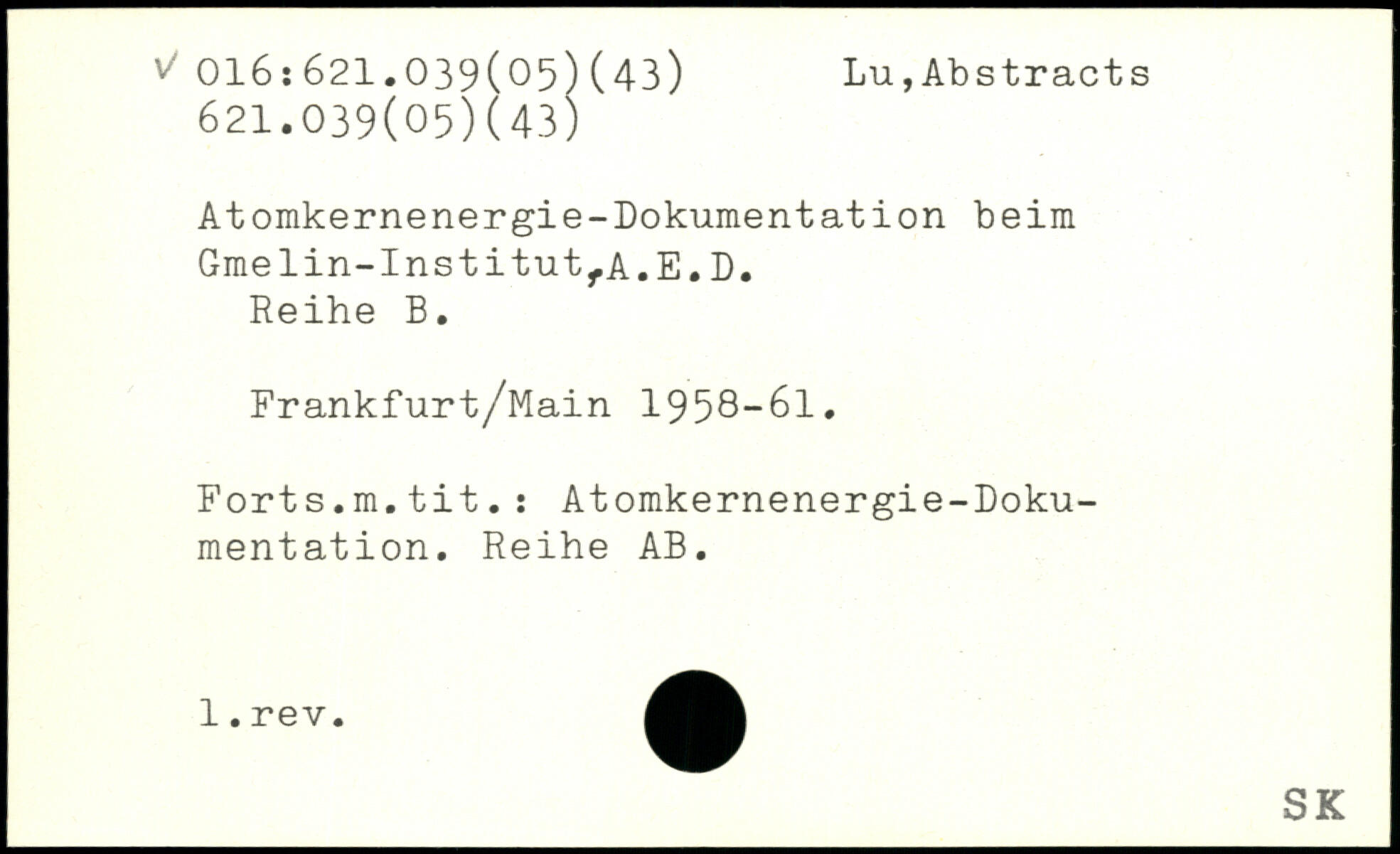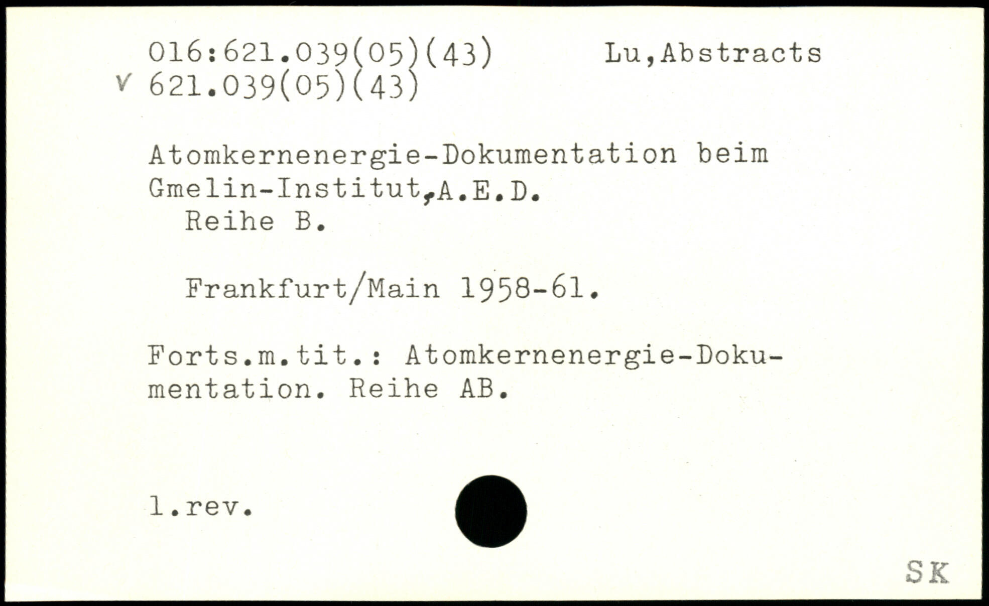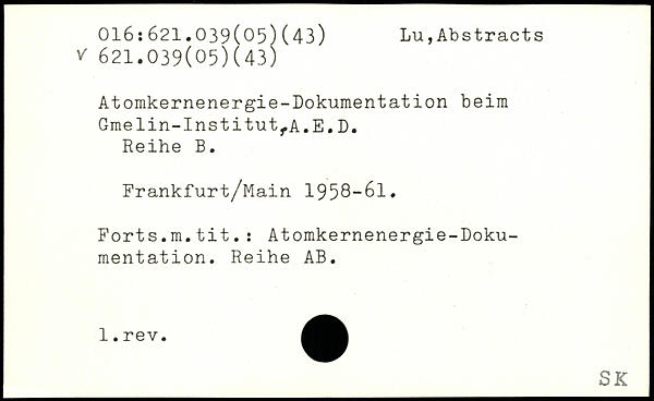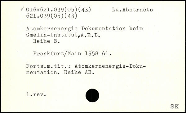 Atomkernenergie-Dokumentation beim Gmelin-InstitutfA.E.D. Reihe B. Frankfurt/Main 1958-61. Forts.m.tit.: Atomkernenergie-Dokumentation. Reihe AB.