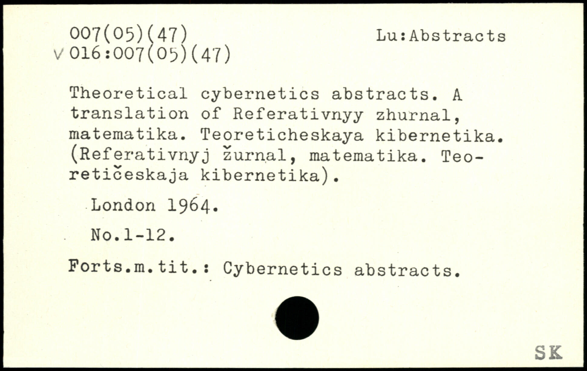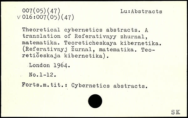 Theoretical cybernetics abstracts. A translation of Referativnyy zhurnal, matematika. Teoreticheskaya kibernetika. (Referativnyj zurnal, matematika. Teo-reticeskaja kibernetika).