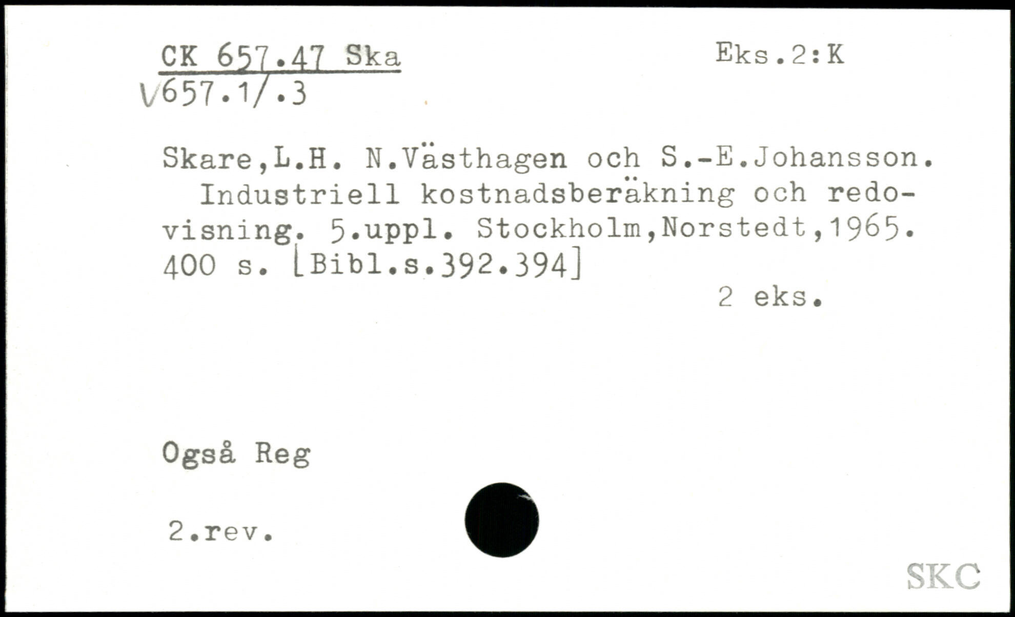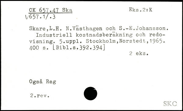 Skare,L.H. N.Vasthagen och S.-E.Johansson. Industriell kostnadsberäkning och redovisning.
