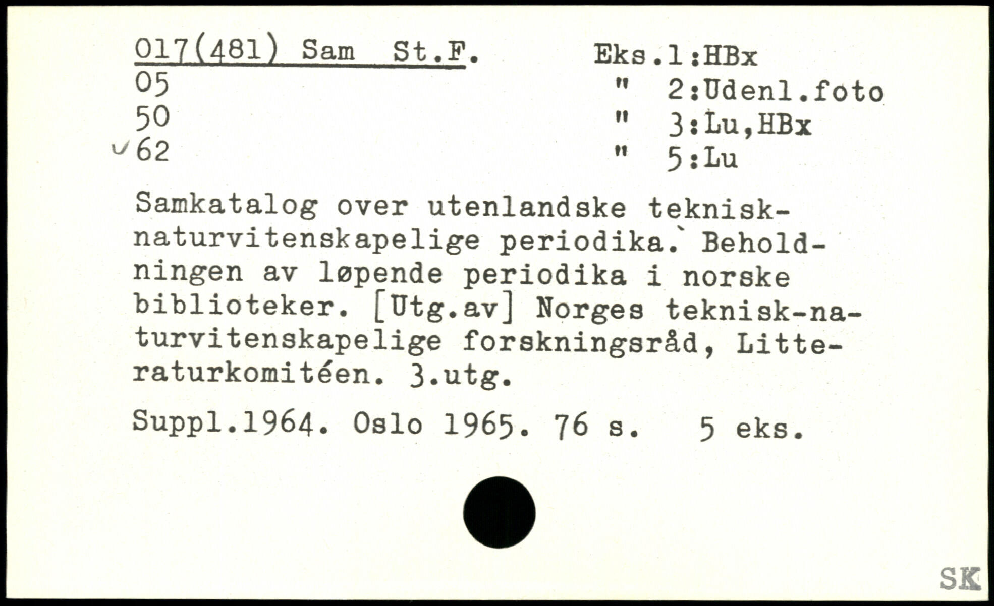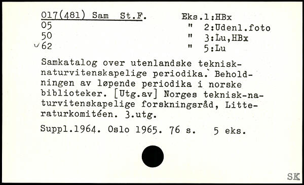 .5 M 2:Udenl.foto 50 " 3:Lu,HBx ^62 , 5jLu Samkatalog over utenlandske teknisk-naturvi tenskape lige periodika.' Beholdningen av løpende periodika i norske biblioteker. [Utg.av] Norges teknisk-na-turvitenskapelige forskningsråd, Litteraturkomitéen. 3-utg. Suppl.1964. Oslo 1965.