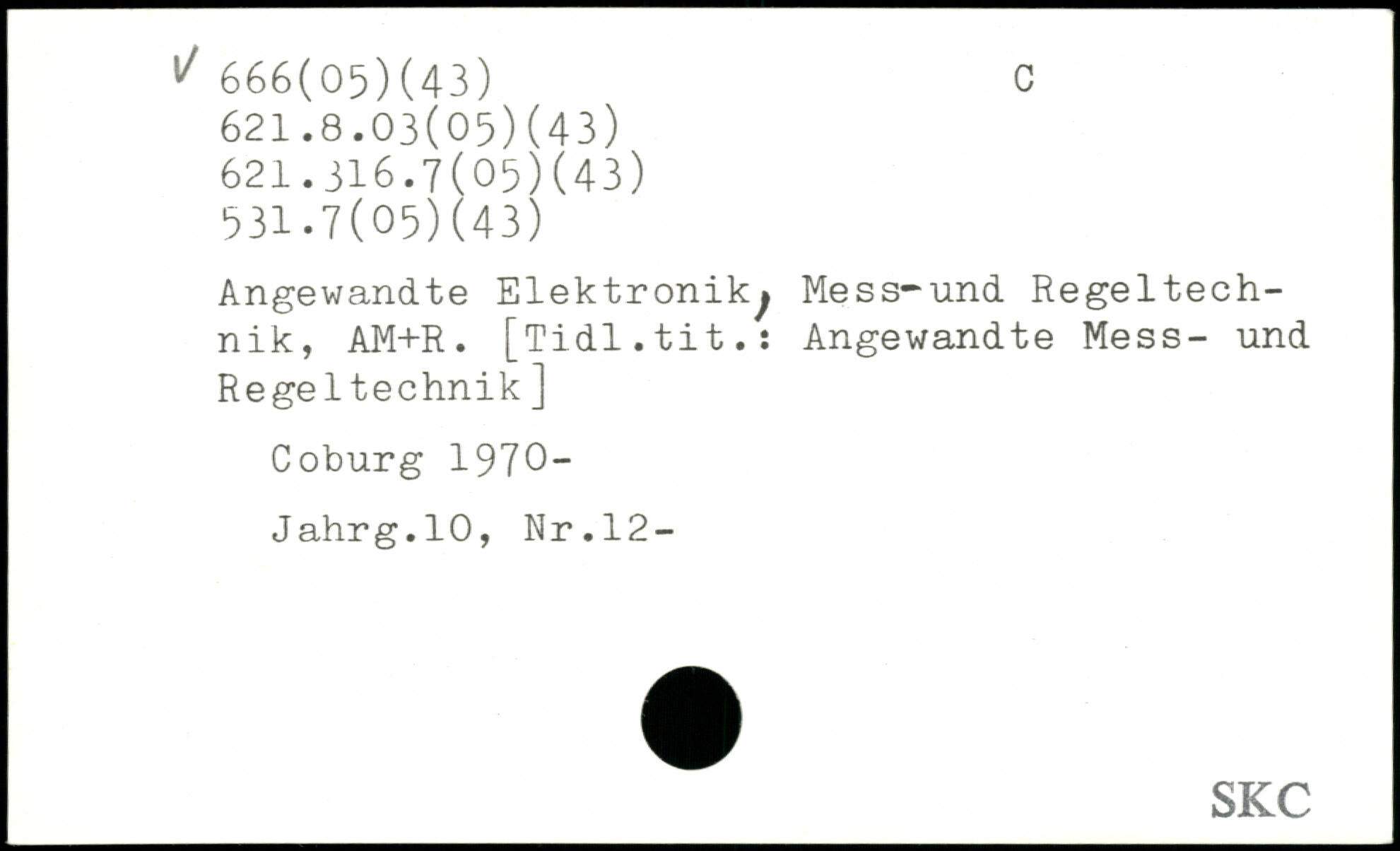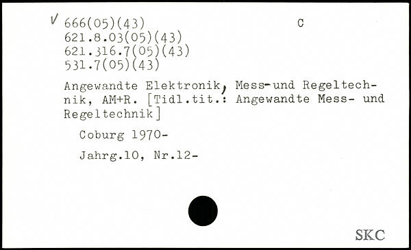 Angewandte Elektronik^ Mess-und Regeltech-nik, AM+R. [Tidl.tit.: Angewandte Mess- und Rege 1technik] Coburg 1970“ Jahrg.10, Nr.12-