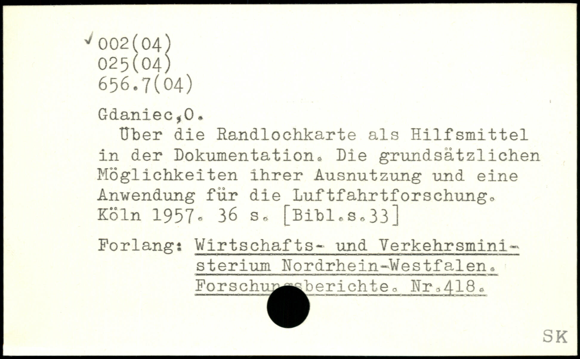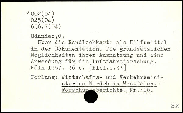 Uber die Randlochkarte als Hilfsmittel in der Dokumentation,, Die grundsätzlichen Möglichkeiten ihrer Ausnutzung und eine Anwendung für die Luftfahrtforschungo