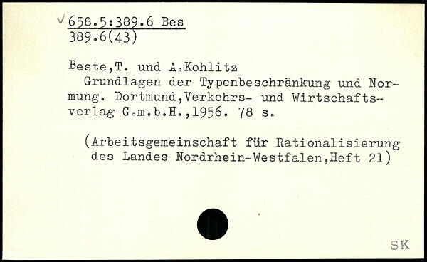 Beste,T. und A^Kohlitz Grundlagen der Typenbeschränkung und Normung. Dortmund,Verkehrs- und Wirtschaftsverlag Gom.b.H.,1956.