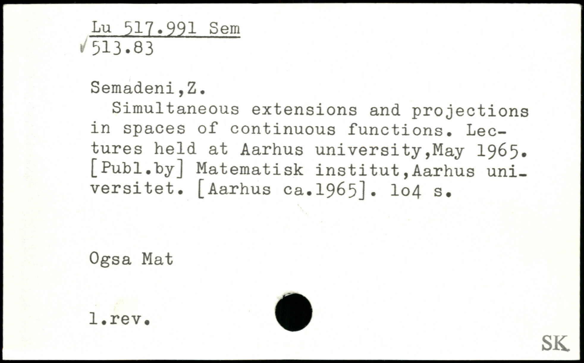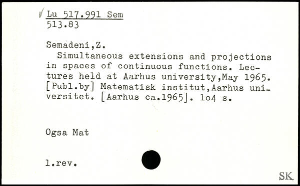 Simultaneous extensions and projections in spaces of continuous functions. Lectures held at Aarhus university,May 1965. [Publ.hy] Matematisk institut,Aarhus uni-versitet. [Aarhus ca.1965]. I