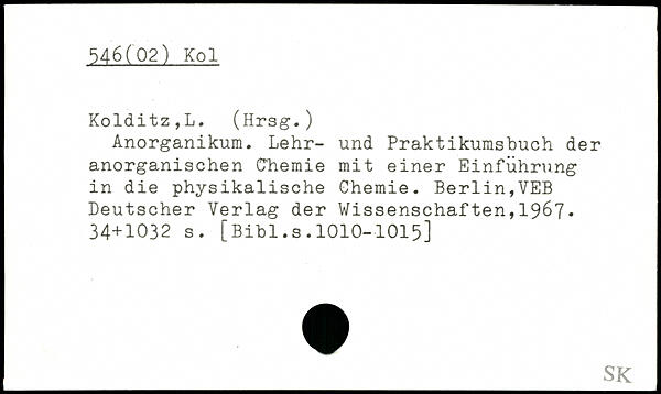 Anorganikum. Lehr- und Praktikumsbuch der anorganischen Chemie mit einer Einführung in die physikalische Chemie. Berlin,VEB Deutscher Verlag der Wissenschaften,1967