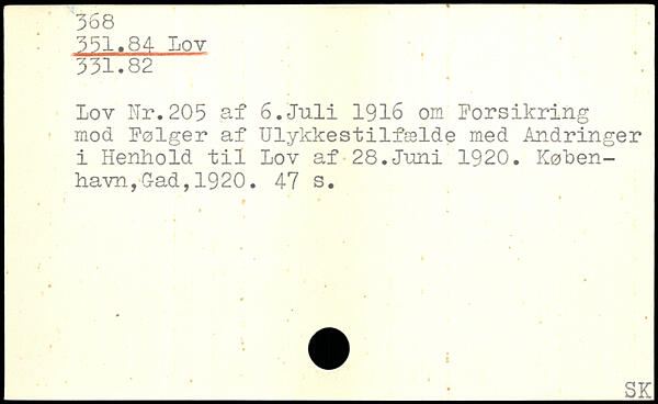 lov Ur.205 af 6.Juli 1916 om Forsikring mod Følger af Ulykkestilfælde med Andringer i Henhold til lov af 28.Juni 1920.