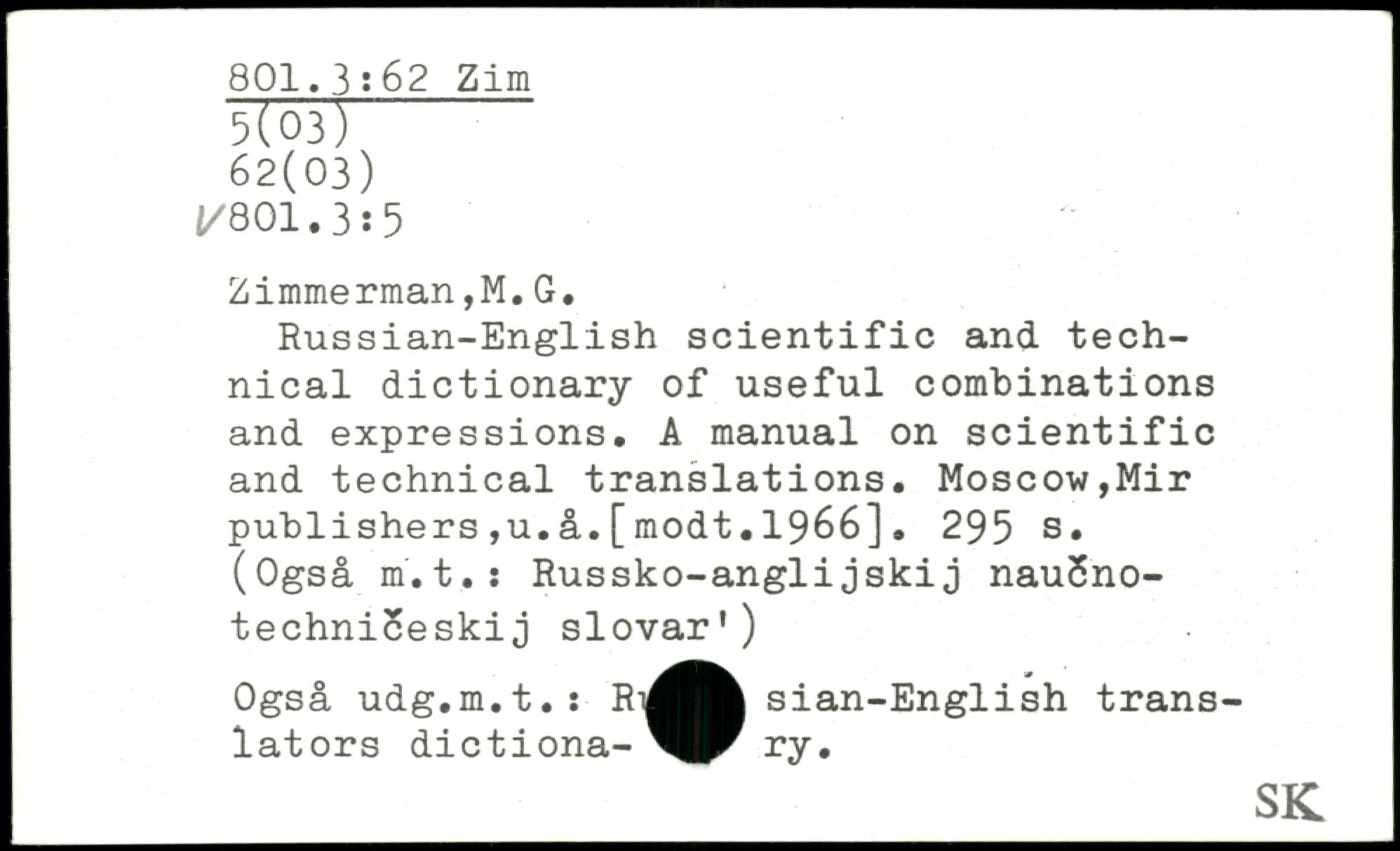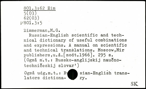 Russian-English scientific and technical dictionary of useful combinations and expressions. A manual on scientific and technical translations. Moscow,Mir publishers,u.a.[modt.1966]