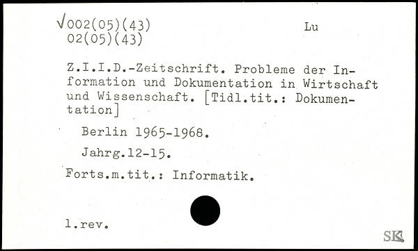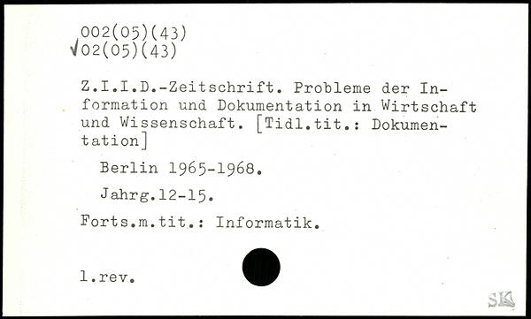 Z.I.I.D.-Zeitschrift. Probleme der Information und Dokumentation in Wirtschaft und Wissenschaft. [Tidl.tit.: Dokumentation]