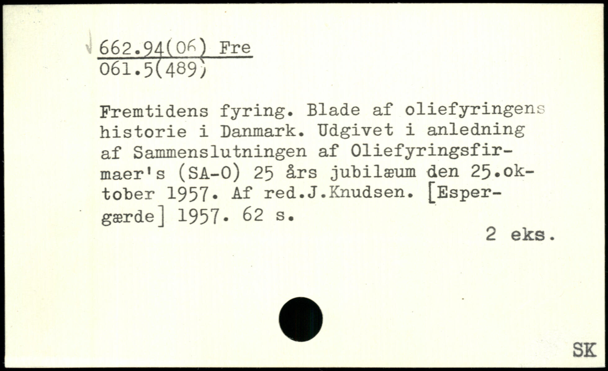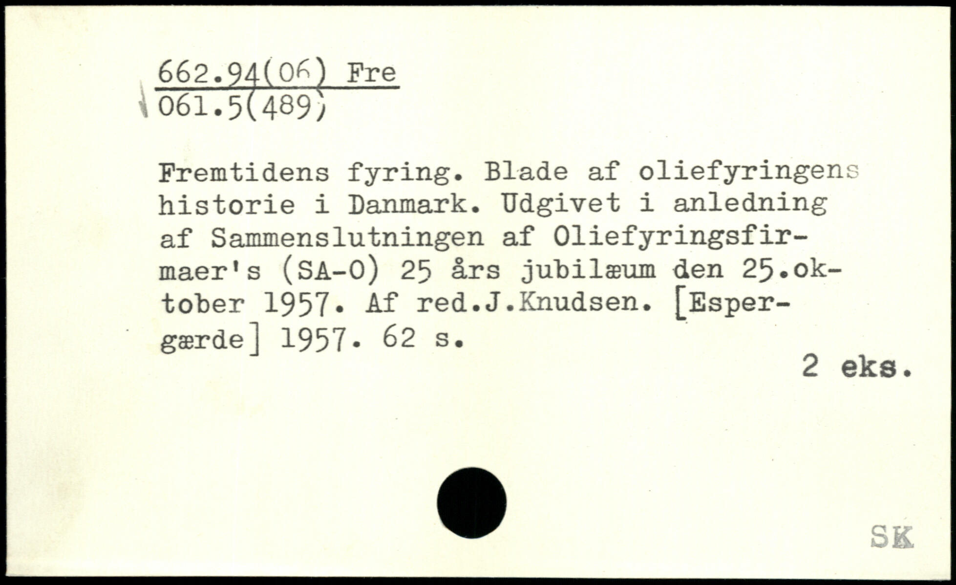 Fremtidens fyring. Blade af oliefyringens historie i Danmark. Udgivet i anledning af Sammenslutningen af Oliefyringsfir-maer's (SA-0) 25 års jubilæum den 25,oktober 1957, Af red.J.Knudsen. [Esper-gærde] 1957