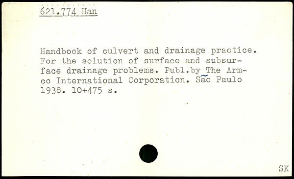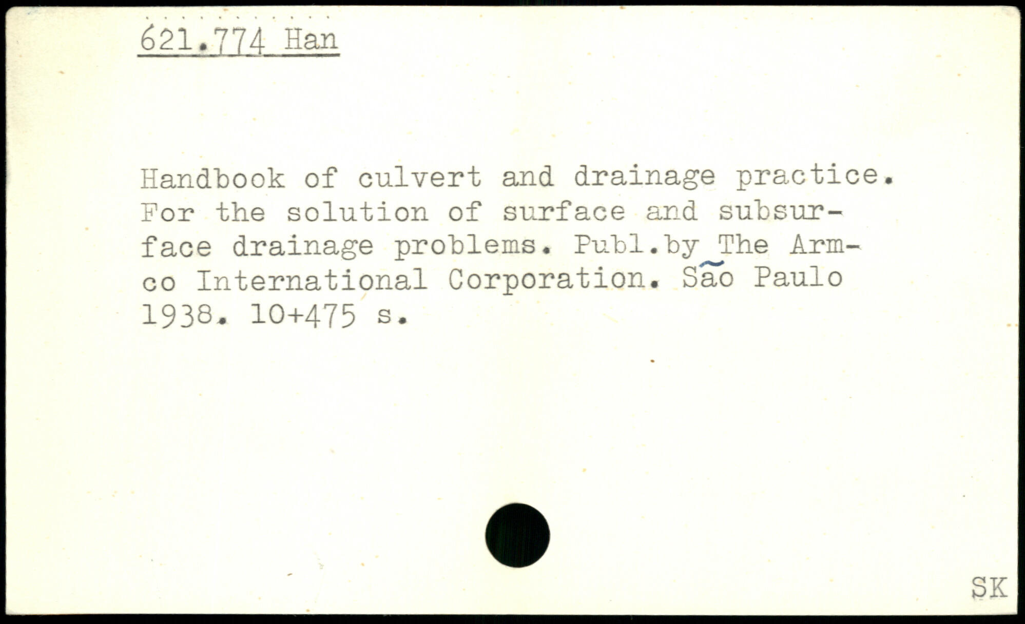 Handbook of culvert and drainage practice. For the solution of surface and subsurface drainage problems. Fubl.by The Arm-co International Corporation. Sao Paulo 1938.