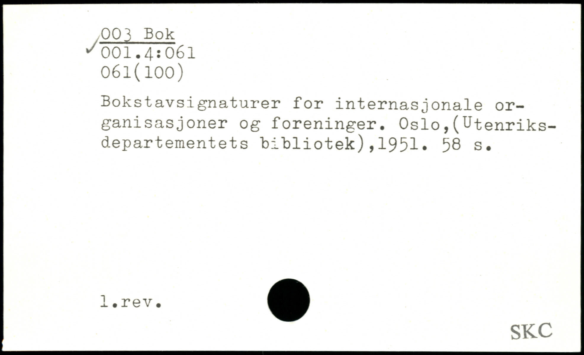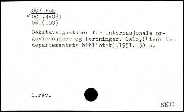 Bokstavsignaturer for internasjonale or-ganisasjoner og foreninger. Oslo,(Utenriks-departementets bibliotek),1951.