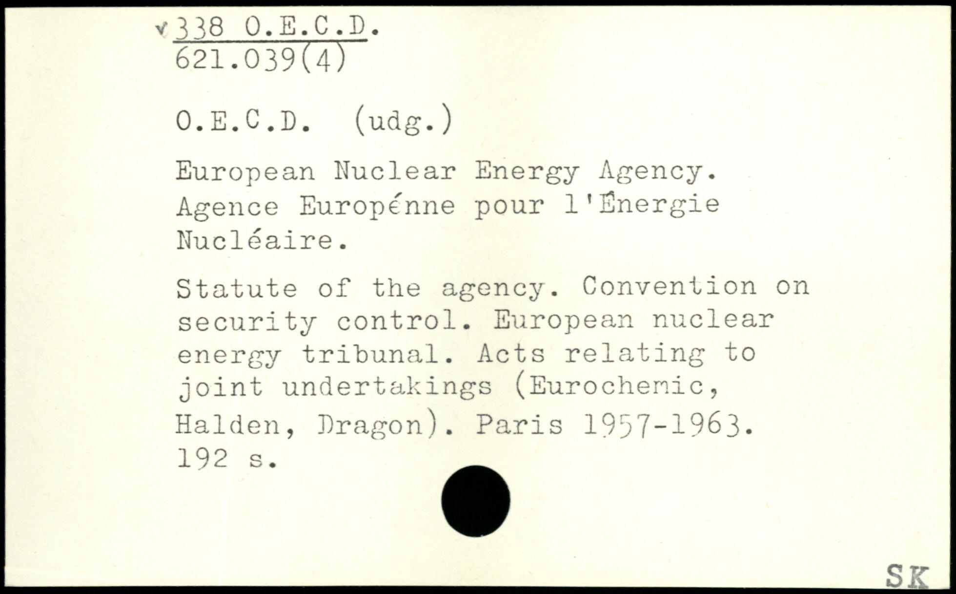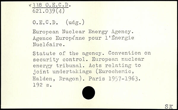 European Nuclear Energy Agency. Agence Européenne pour l'Energie Nucléaire. Statute of the agency. Convention on security control. European nuclear energy tribunal. Acts relating to joint undertakings (Eurochenic, Halden, Dragon).