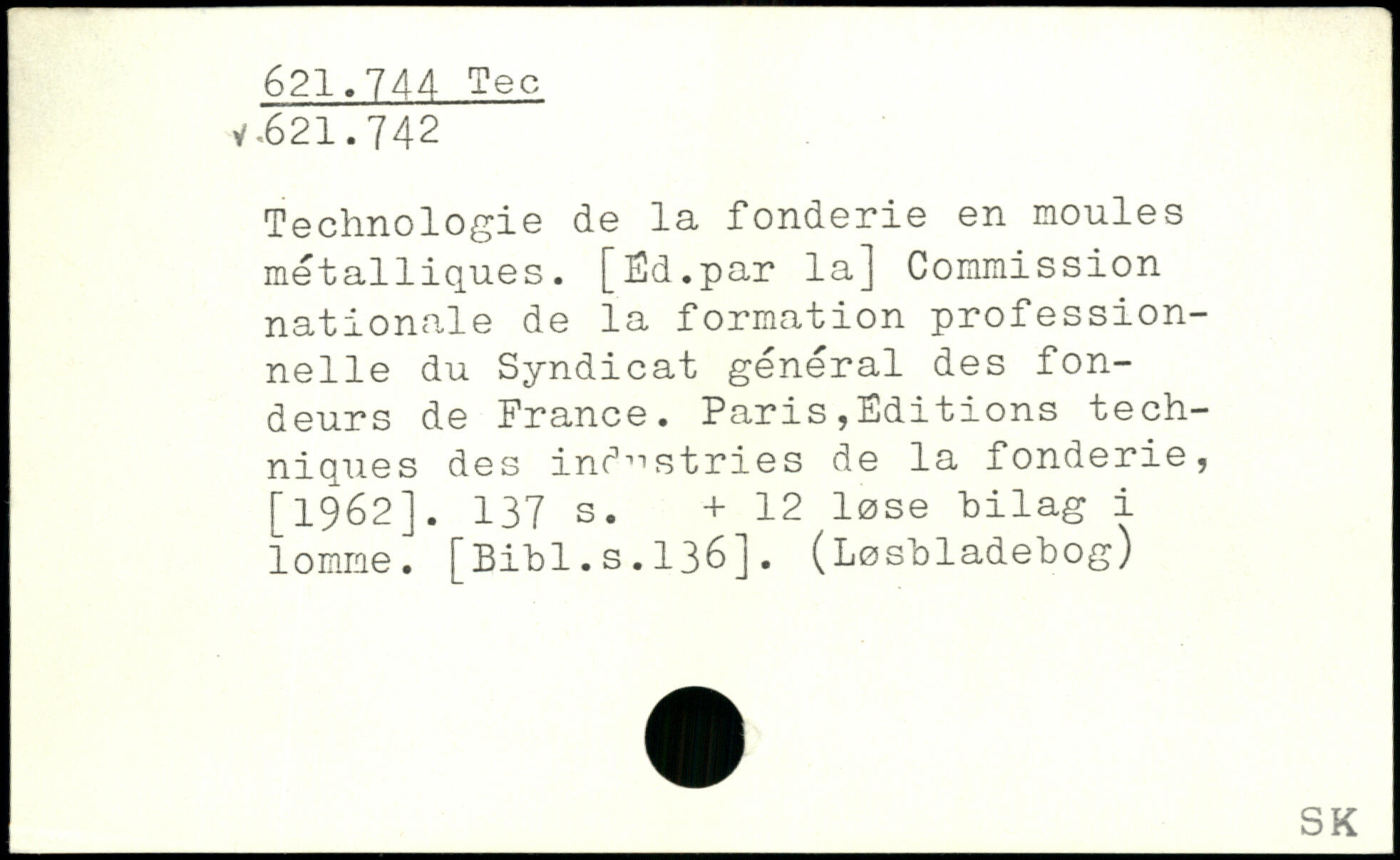 Technologie de la fonderie en moules métalliques. [Fd.par la] Commission nationale de la formation professionnelle du Syndicat général des fondeurs de France. Paris,Editions techniques des industries de la fonderie, [1962].