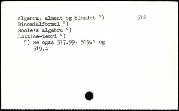 Algebra, al ment og blandet .) 512 Binomi alformel .) Boole.s algebra .) Lattiee-teori .) .) Se også 517.99, 519.1 .g 519.4