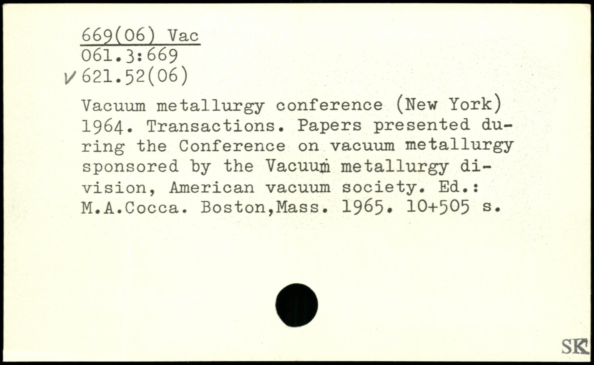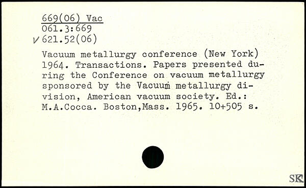 Vacuum metallurgy conference (New York) 1964. Transactions. Papers presented during the Conference on vacuum metallurgy sponsored by the Vacuum metallurgy division, American vacuum society. Ed.: M.A.Cocca. Boston,Mass. 1965.