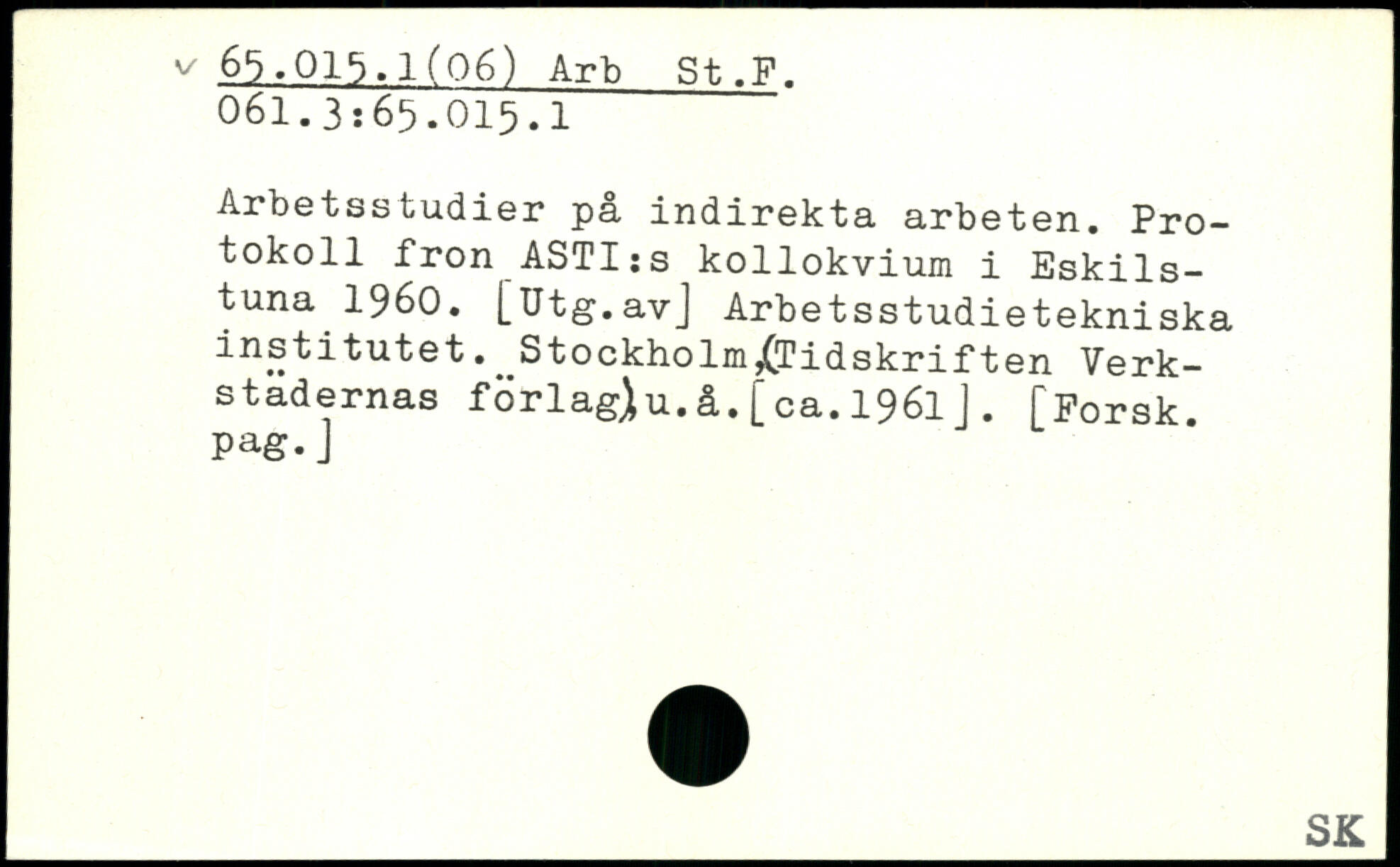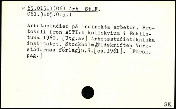 Arbetsstudier på indirekta arbeten. Protokoll fron_ASTI:s kollokvium i Eskilstuna 1960. [Utg.avJ Arbetsstudietekniska institutet. Stockholm^Tidskriften Verkstadernas förlag)u.å.[ca.1961J. [Forsk. Pag. J