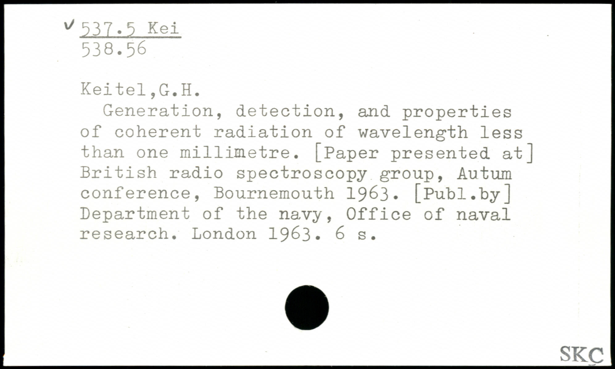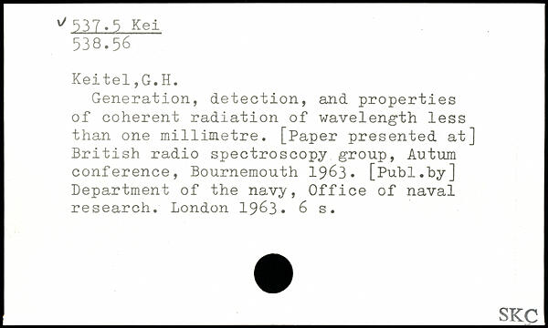 Generation, detection, and properties of coherent radiation of wavelength less than one m1111metre. [Paper presented at] British radio spectroscopy group, Autum conference, Bournemouth 1963.