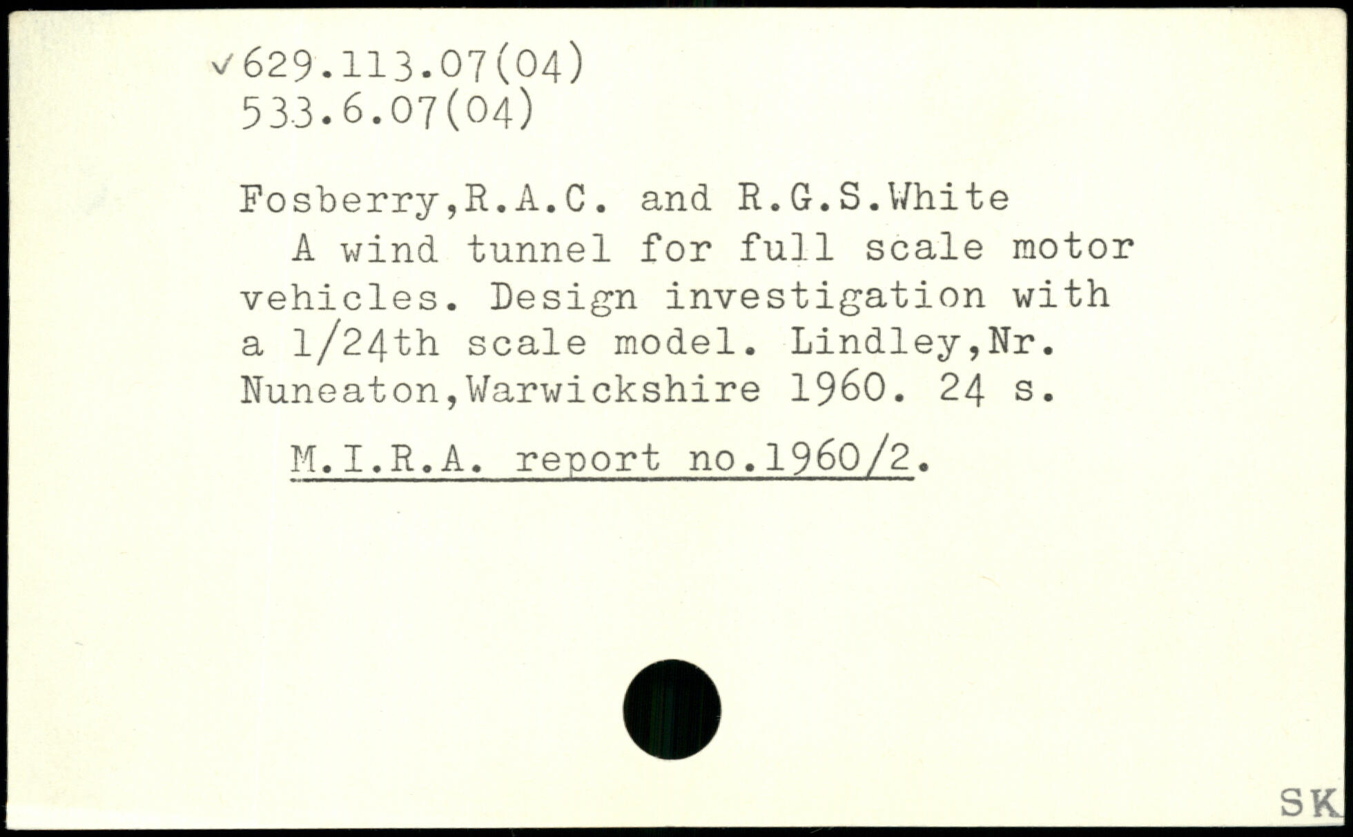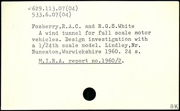 A wind tunnel for full scale motor vehicles. Design investigation with a l/24th scale model. Lindley,Nr. Nuneaton,Warwickshire 1960.