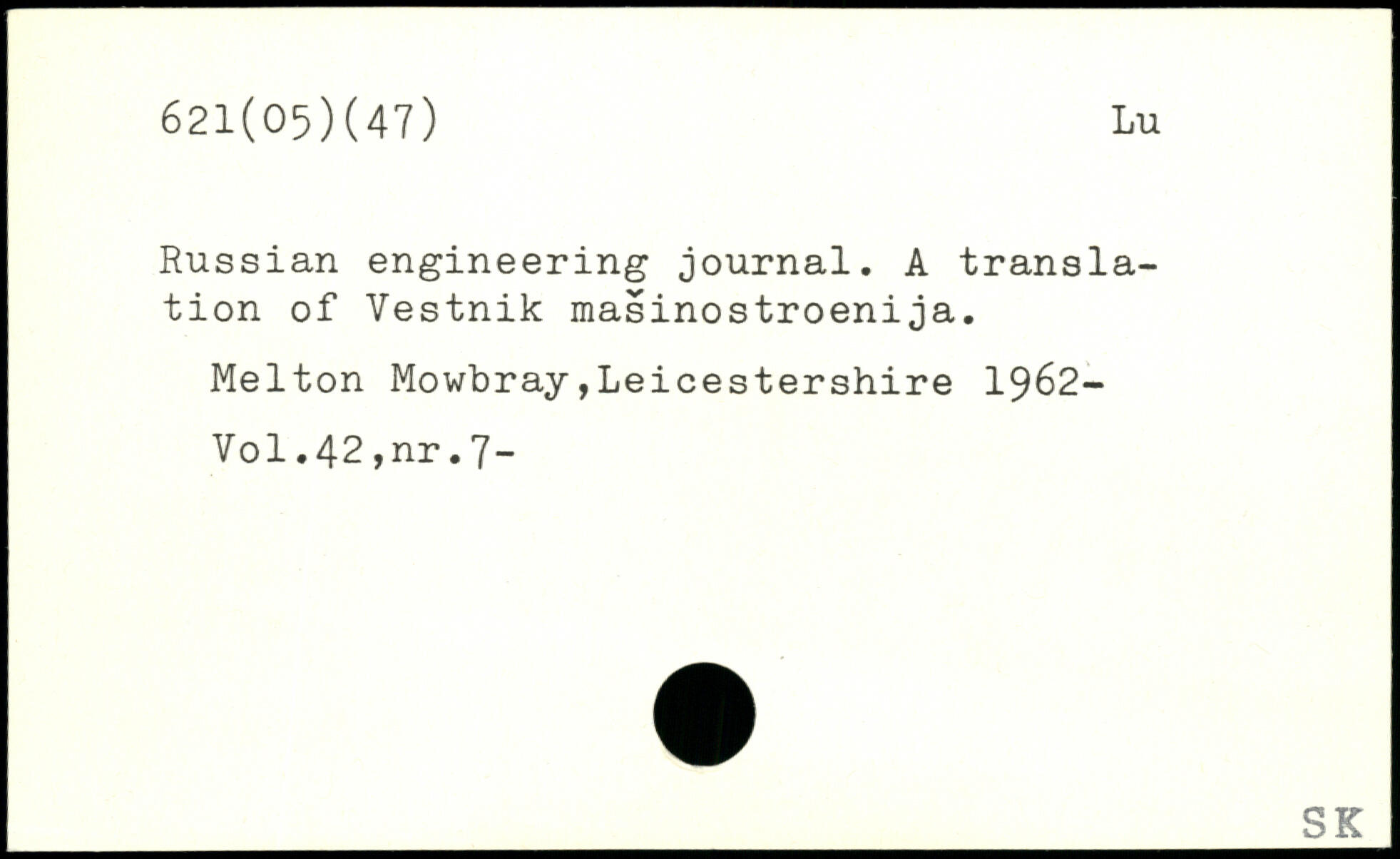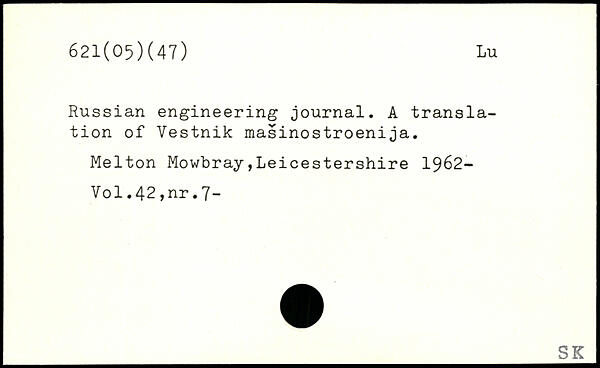 Russian engineering journal. A translation of Vestnik masinostroenija. Melton Mowbray,Leicestershire 1962-