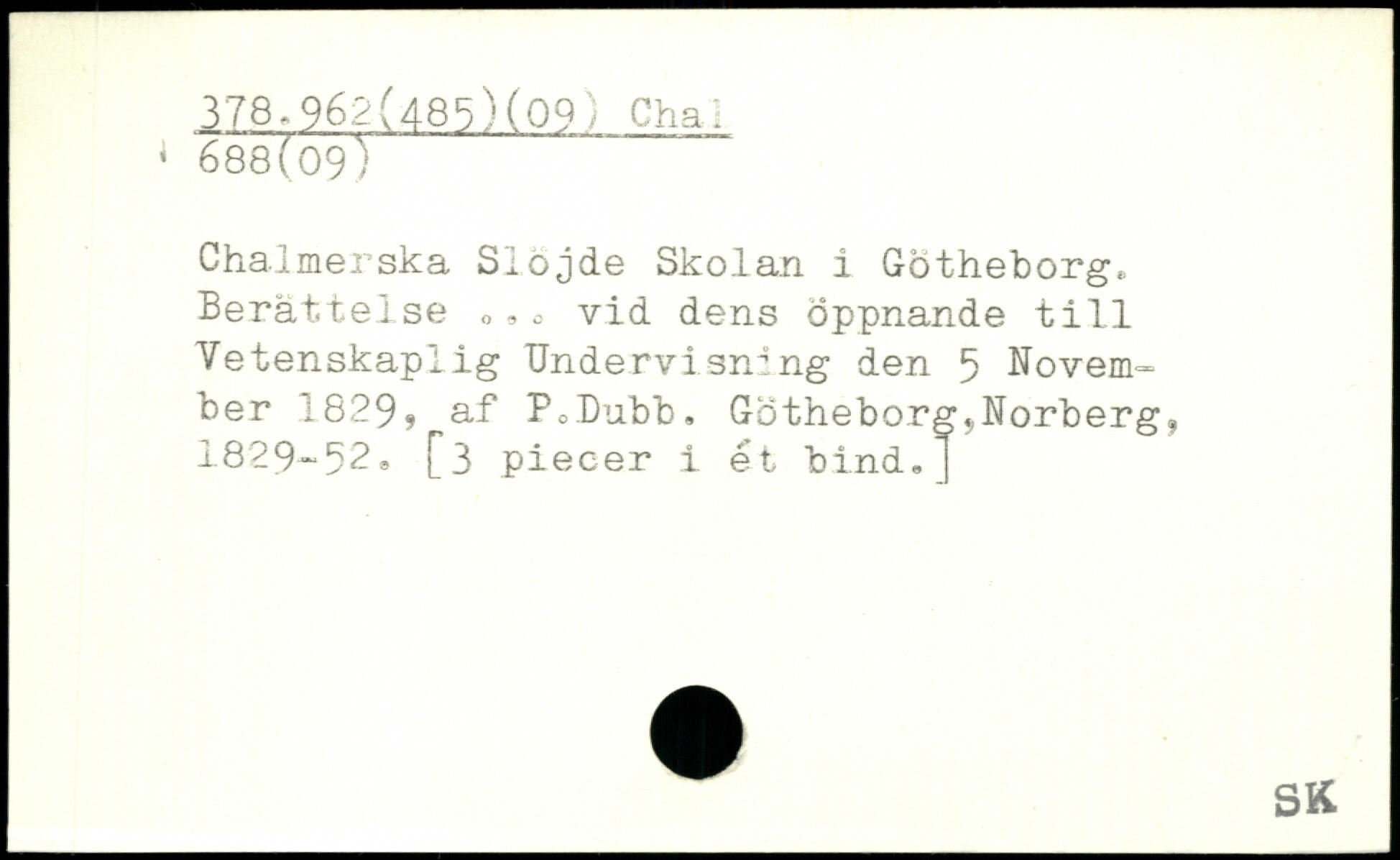 Chal.merska Slöjde Skolan i Götheborg. Berättelse ,,o vid dens Öppnande till Vetenskaplig Undervisning den 5 November 1829. af PoDubb. Gotheborg,.Norberg, 1829-52, [3 piecer i et bind.]