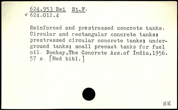 Reinforced and prestressed concrete tanks. Circular and rectangular concrete tanks. prestressed circular concrete tanks; underground tanks; small precast tanks for fuel oil, Bombay,The Concrete Ass.of India,1956.