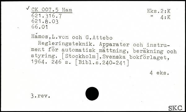 Regleringsteknik. Apparater och instrument for automatisk mattning, beräkning och styring. [Stockholm],Svenska bokförlaget, 1964.