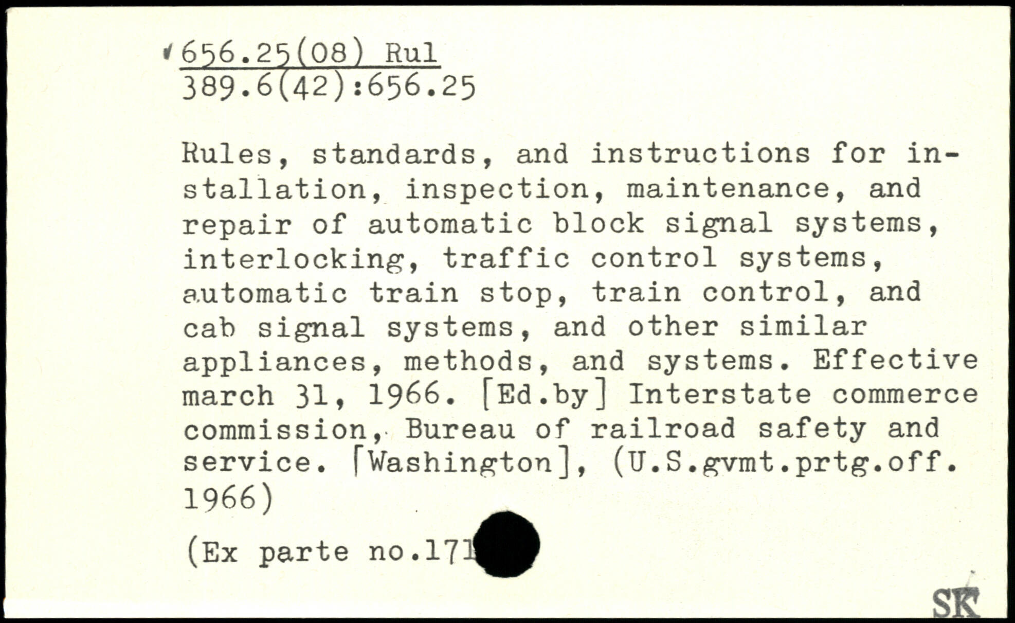 Rules, standards, and instructions for installation, inspection, maintenance, and repair of automatic block signal systems, interlocking, traffic control systems, a.utomatic train stop, train control, and cab signal systems, and other similar appliances, methods, and systems. Effective march 31. 19^6. [Ed.by] Interstate commerce commission, Bureau of railroad safety and service. [Washington], (ïï.S.gvmt.prtg.off. 1966) (Ex parte no.17 _S£_