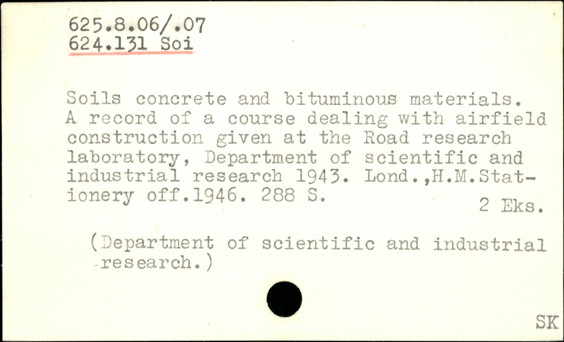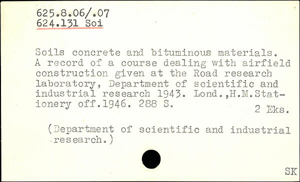 Soils concrete and bituminous materials. A record of a course dealing with airfield construction given at the Road research laboratory, Department of scientific and industrial research 1943. Lond.,H.M.Stationery off.1946.