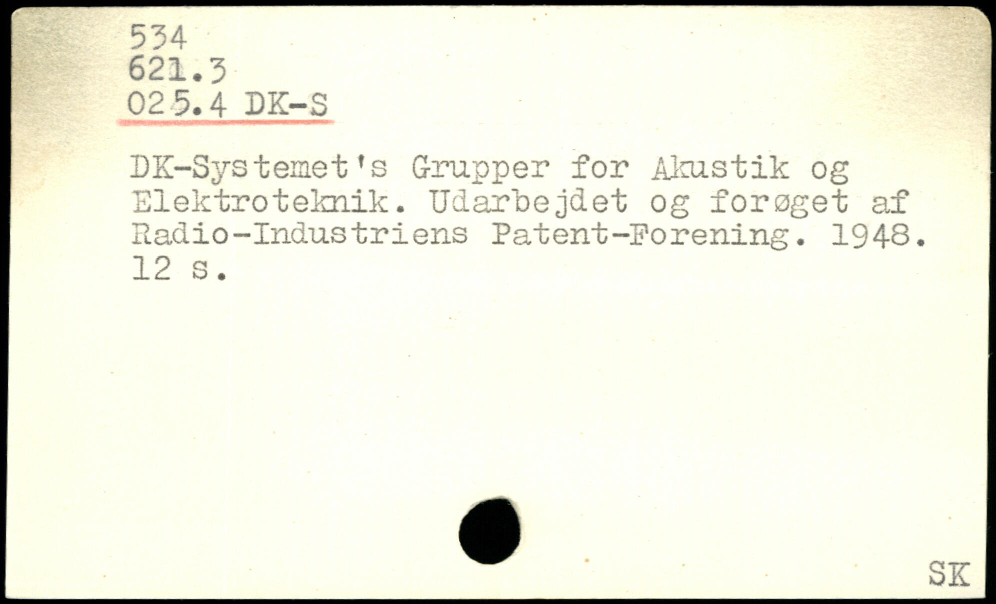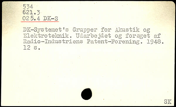 DK-Systeinet’s Grupper for Akustik og Elektroteknik. Udarbejdet og forøget af Radio-Industriens Patent-Forening. 1948.