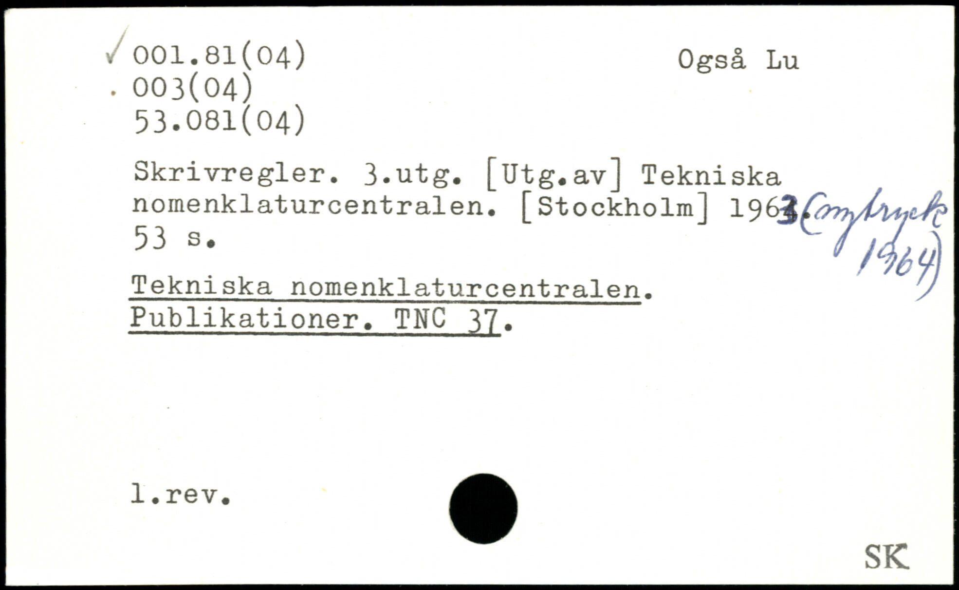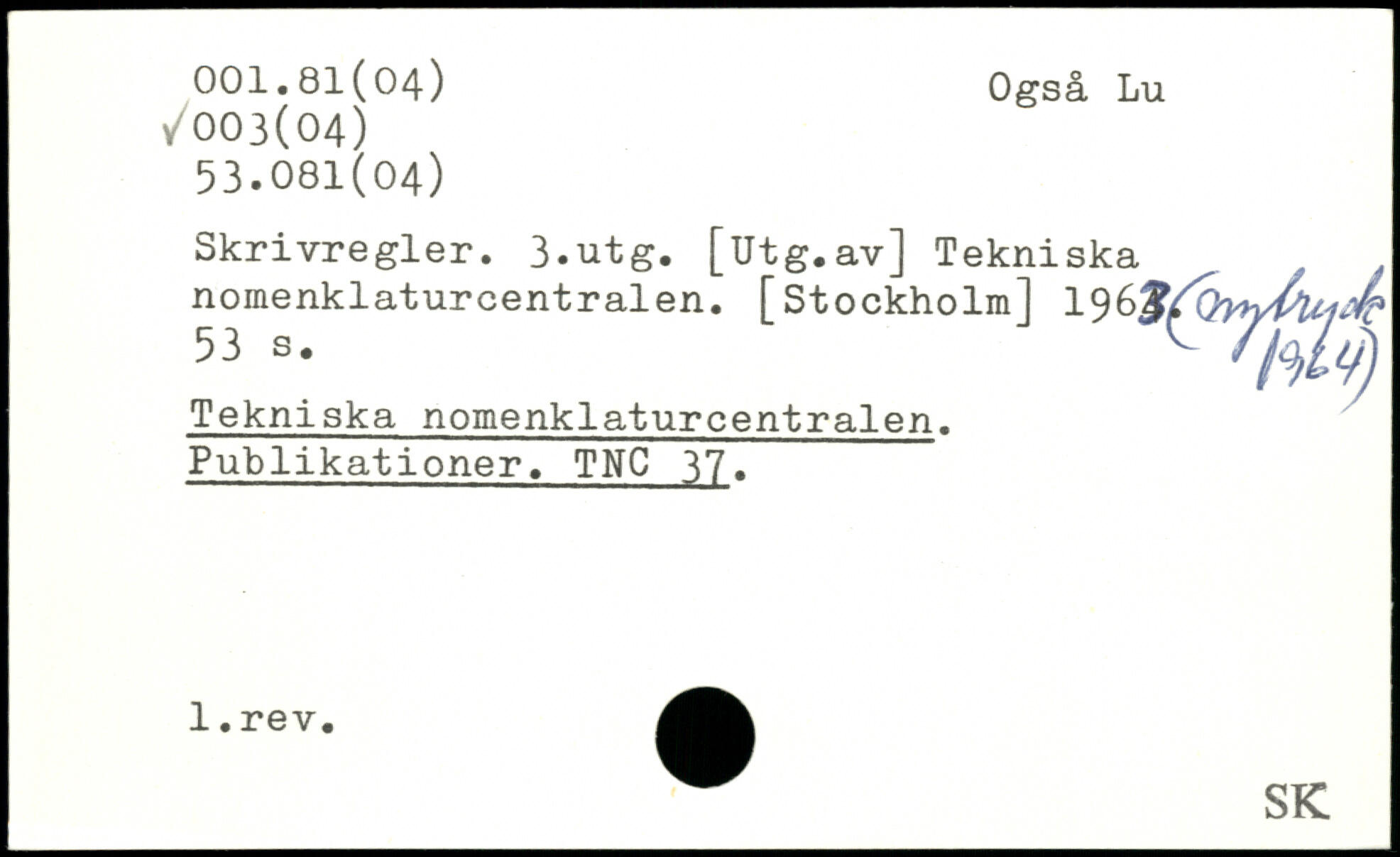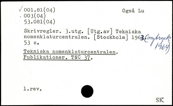 Skrivregler. 3.utg. [utg.av] Tekniska nomenklaturcentralen. [Stockholm] 196 Tekniska nomenklaturcentralen. y Publikationer. TNC 37. sk: