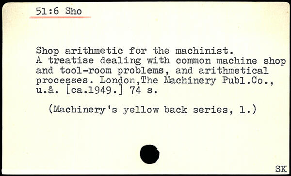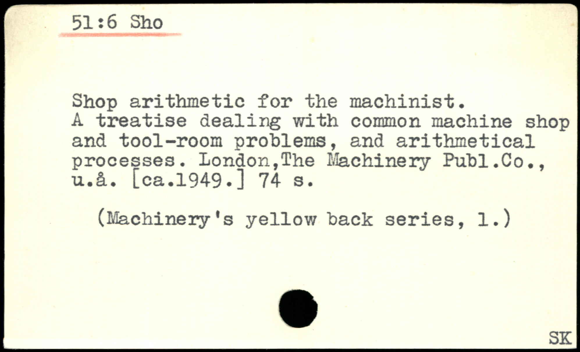 Shop arithmetic for the machinist. A treatise dealing with common machine shop and tool-room problems, and arithmetical processes. London,The Machinery Publ.Co,, u.&. [ca.1949.]