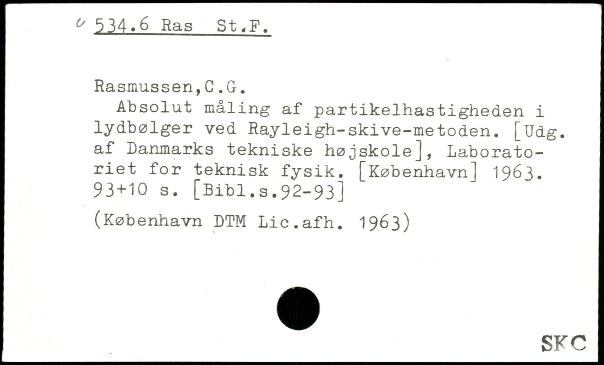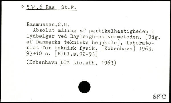 Absolut måling af partikelhastigheden i lydbølger ved Rayleigh-skive-metoden. [Udg. af Danmarks tekniske højskole], Laboratoriet for teknisk fysik.