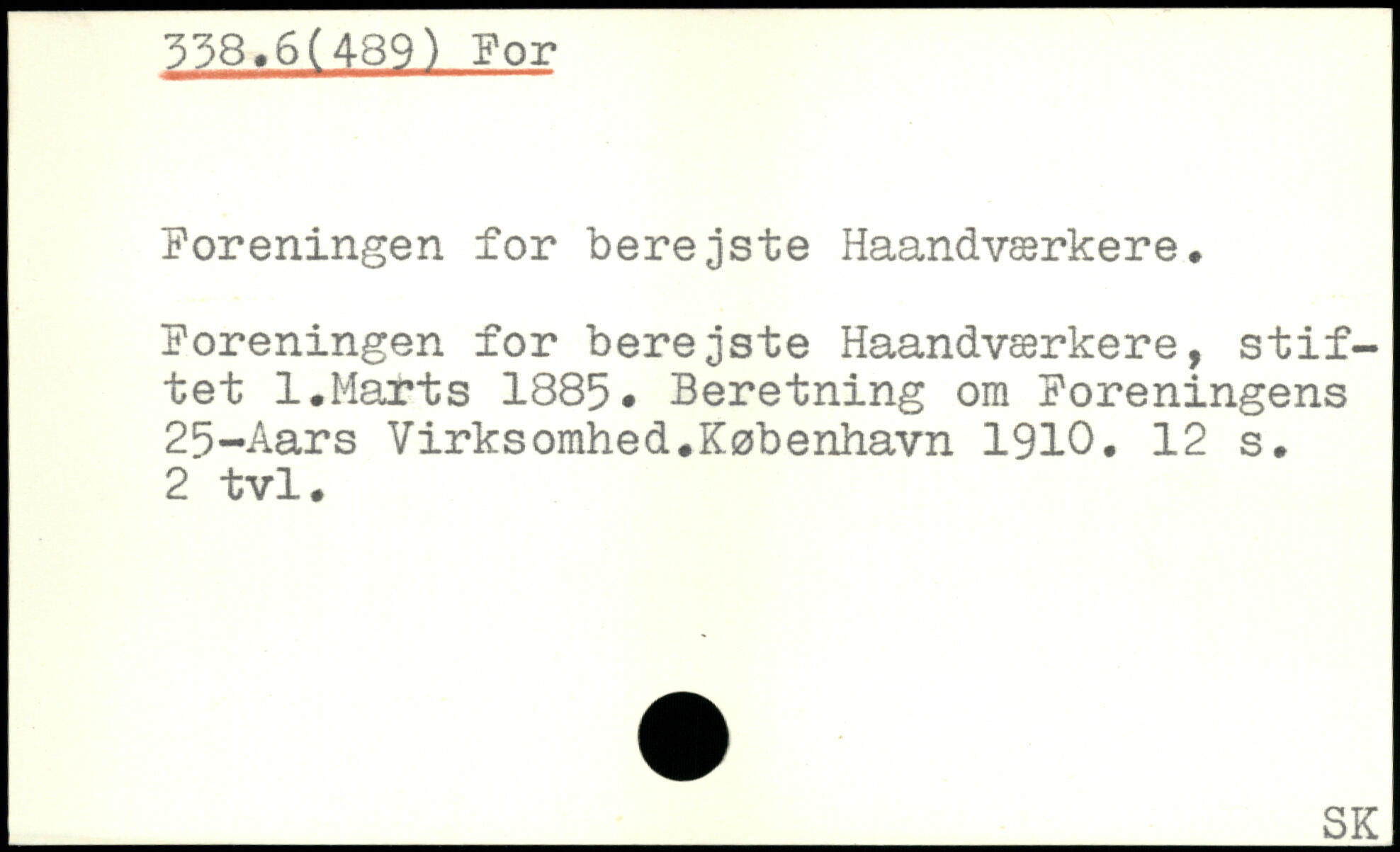 Foreningen for berejste Haandværkere. Foreningen for berejste Haandværkere, stiftet 1.Marts 1885. Beretning om Foreningens 25-Aars Virksomhed.
