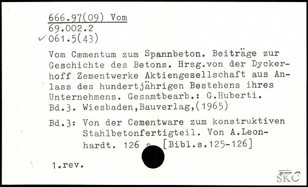 Vom Casmentum zum Spannbeton. Beitrage zur Geschichte des Betons. Hrsg.von der Dyckerhoff Zementwerke Aktiengesellschaft aus Anlass des hundertjährigen Bestehens ihres Unternehmens. Gesamtbearb.: G.Huberti.