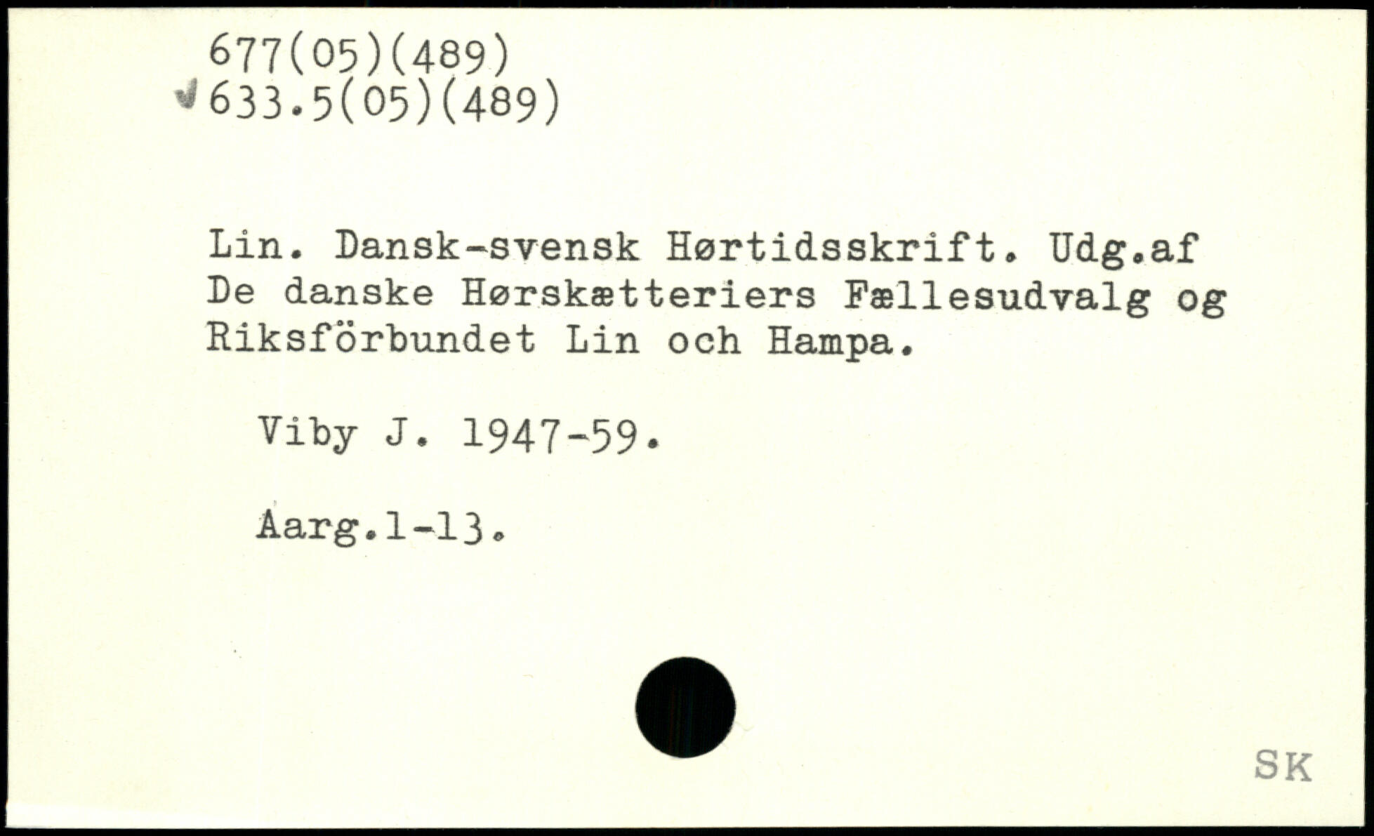 Lin. Dansk-svensk Hørtidsskrift. Udg.af De danske Hørskætteriers Fællesudvalg og Riksförbundet Lin och Hampa. Viby J. 1947-59. Aarg.1-13.