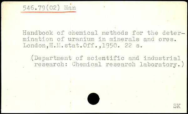 Handbook of chemical methods for the determination of uranium in minerals and ores. London,H.M.stat.Off.,1950.