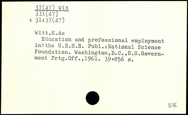 Education and professional employment ini the U.S.S.R. PublRational Scienco Foundation. Washington,D.C.,U.S.Government Prtg.Off.,1961.