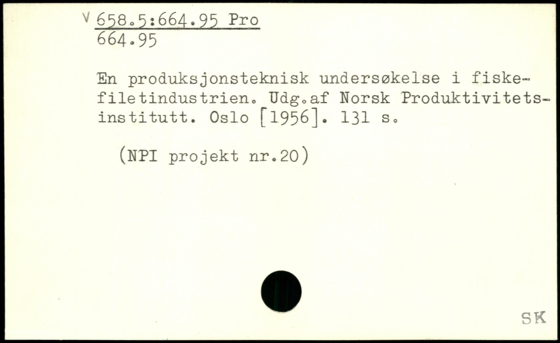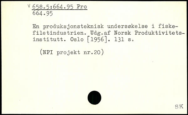 En produksjonsteknisk undersøkelse i fiskefile tindustrien<> Udg,af Norsk Produktivitetsinstitutt. Oslo [1956].