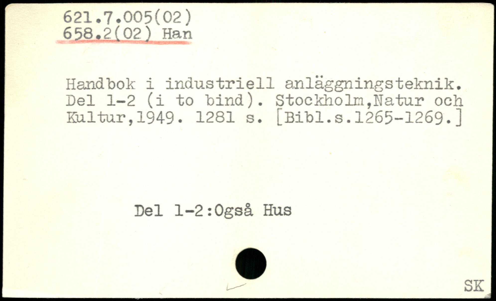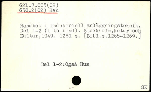 Handbok i industriell anläggningsteknik. Del 1-2 (i to bind). Stockholn,Natur och. Kultur,1949.
