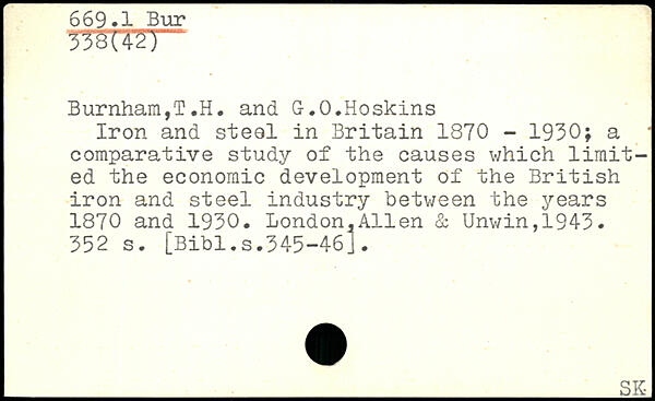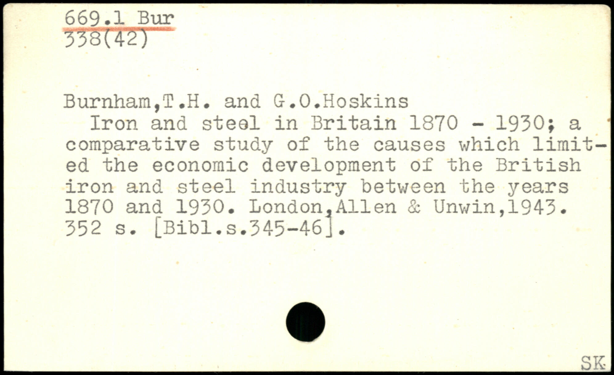 SW'&T" Burnham,'!.H. and G.O.Hoskins Iron and steal in Britain 1870 - 1930; a. comparative study of the causes which limited the economic development of the British iron and steel industry between the years 1870 and 1930.