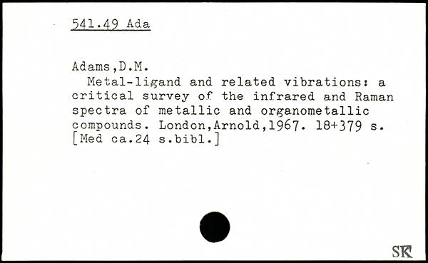 Metal-ligand and related vibrations: a critical survey of the infrared and Raman spectra of metallic and organometallic compounds. London,Arnold,19&7.