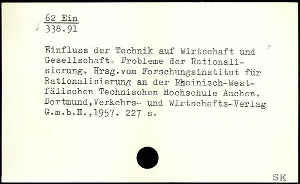Einfluss der Technik auf Wirtschaft und Gesellschaft., Probleme der Rationalisierung. Hrsg.vom Forschungsinstitut für Rationalisierung an der Rheinisch-Westfälischen Technischen Hochschule Aachen. Dortmund,Verkehrs- und Wirtschafts-Verlag G.m.b.H.,1957.