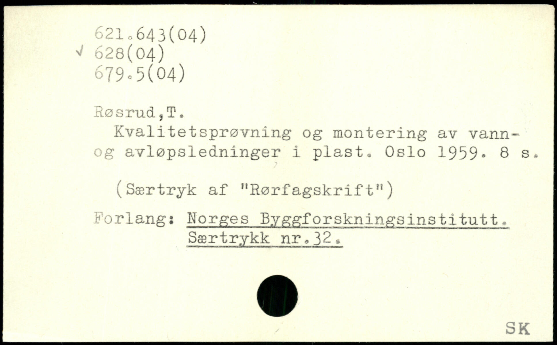 Kvalitetsprøvning og montering av vann-og avløpsledninger i plast. Oslo 1959.