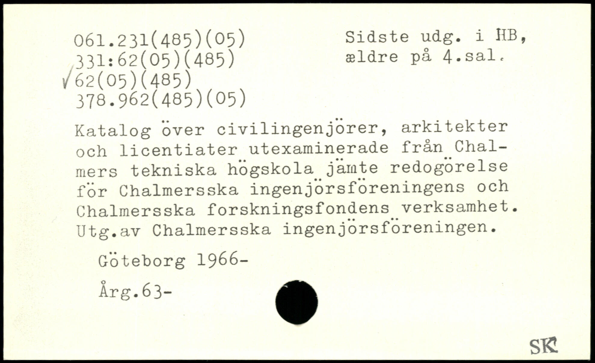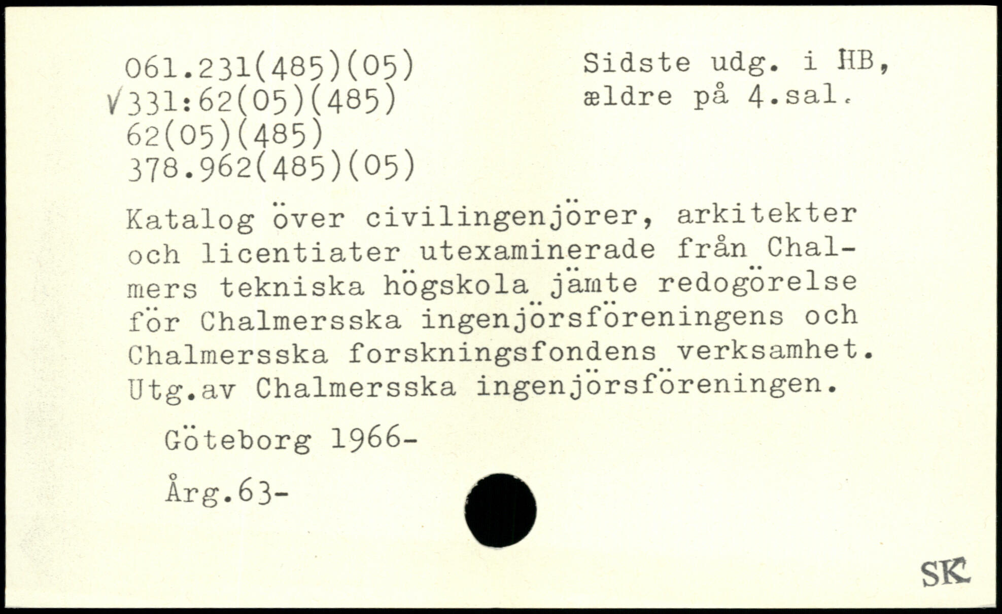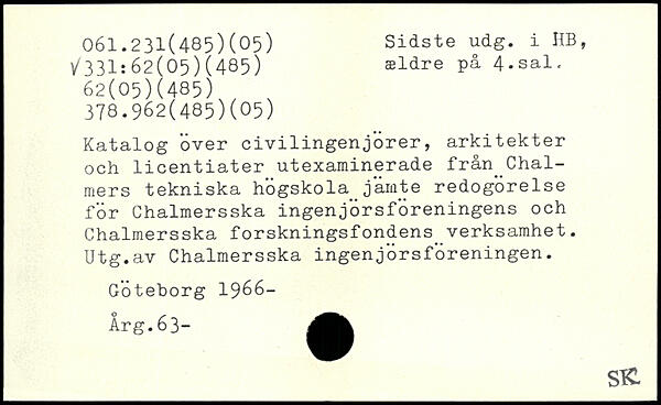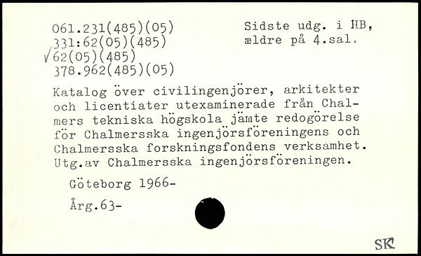 Katalog over civilingenjörer, arkitekter och licentiater utexaminerade från^Chal-mers tekniska högskola_jämte redogörelse för Chalmersska ingenjörsföreningens och Chalmersska forskningsfondens_verksamhet. Utg.av Chalmersska ingenjörsföreningen. Göteborg 1966- Arg.63-