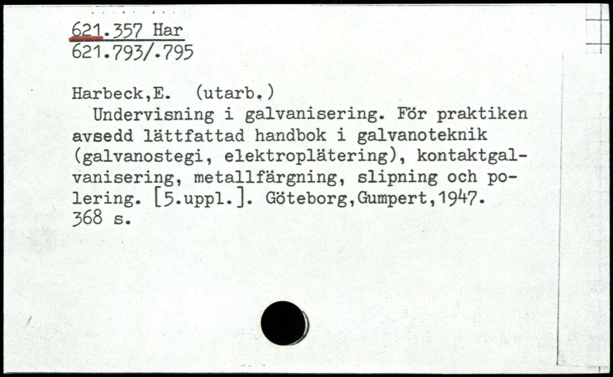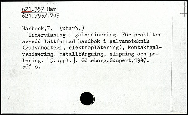 Undervisning i galvanisering. För praktiken avsedd lättfattad handbok i galvanoteknik (galvanostegi, elektroplätering), kontaktgalvanisering, metallfärgning, slipning och polering. [5-uppl.]. Göteborg,Gumpert,19^7-