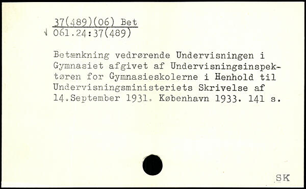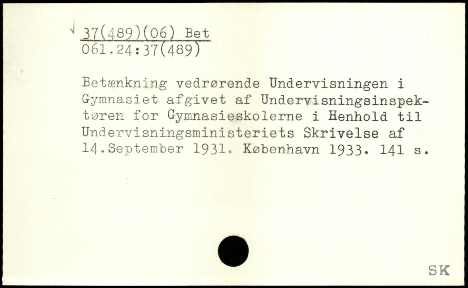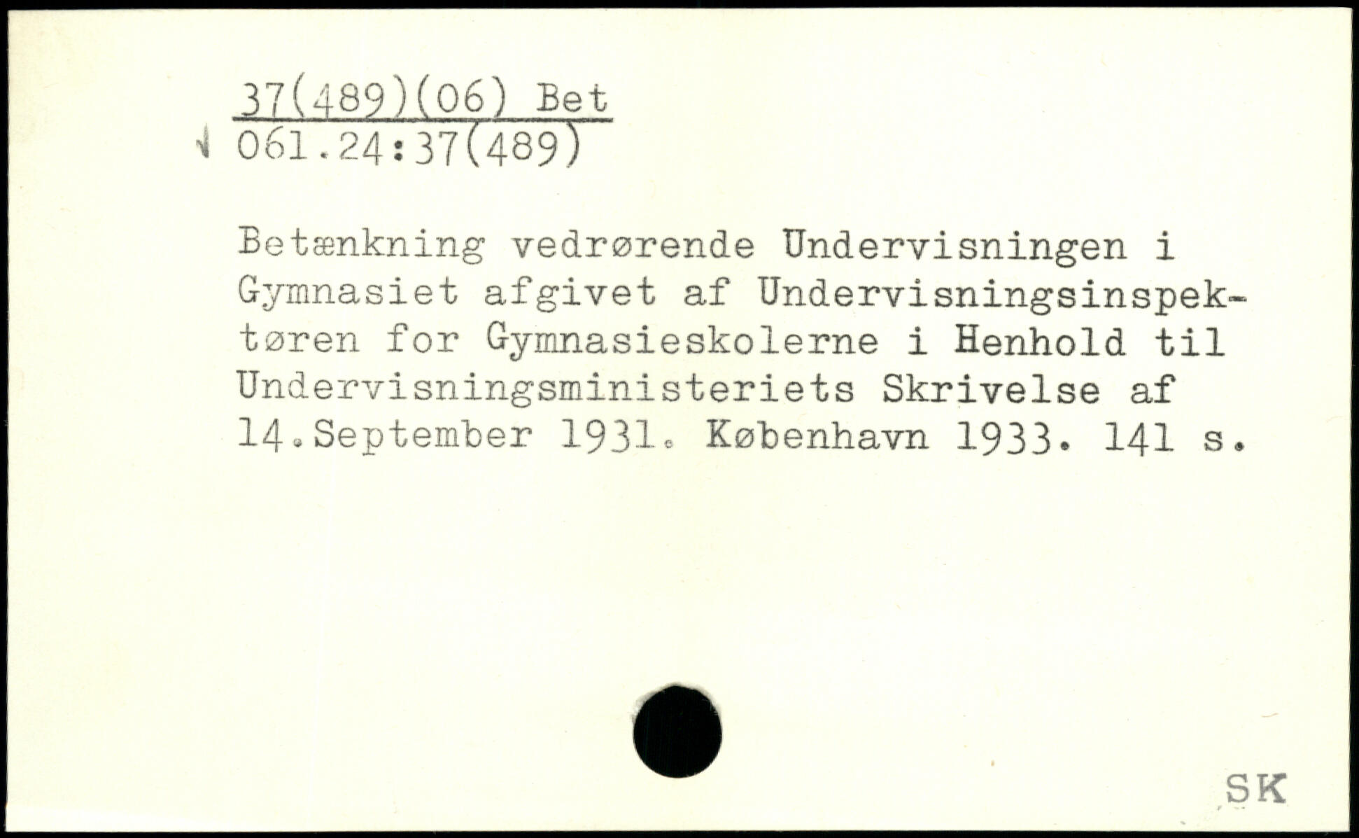 Betænkning vedrørende Undervisningen i Gymnasiet afgivet af Undervisningsinspektøren for Gymnasieskolerne i Henhold til Undervisningsministeriets Skrivelse af 14.September 1931=