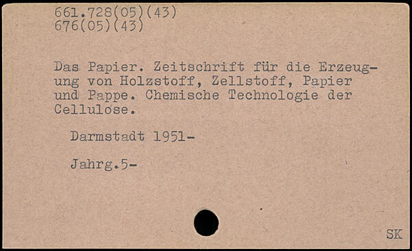 Das Papier. Zeitschrift für die Erzeugung von Holzstoff, Zellstoff, Papier und Pappe. Chemische Technologie der Cellulose. Darmstadt 1951- Jahrg.5- W SK